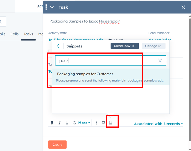 This shortcut prompts HubSpot to show templates related to packaging sample requests.