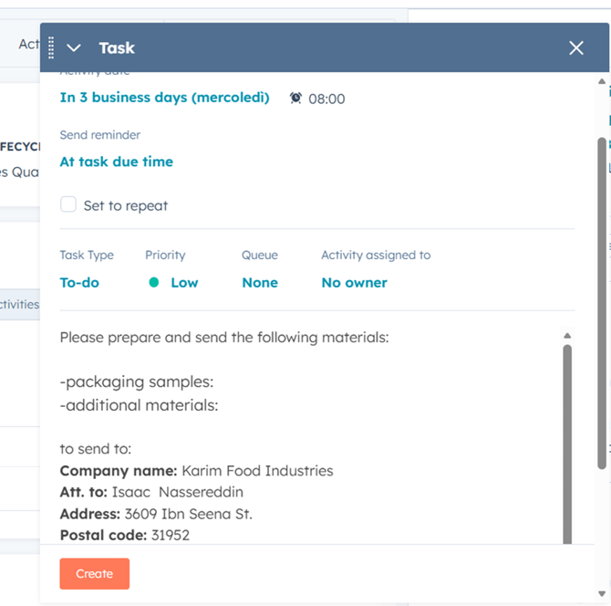 Example: “Packaging samples to Isaac Nassereddin”.
