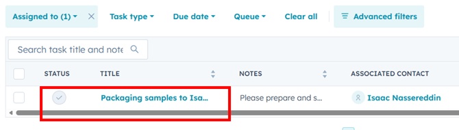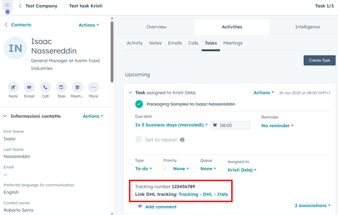 You will be redirected to the contact’s page, where you will find updated information, including the completed task and the tracking number.